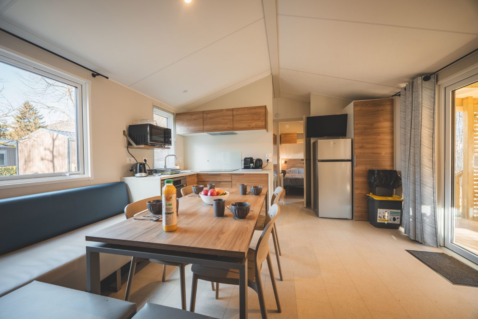 Mobil-home disposant 2 chambres avec 2 salles de bain idéales pour les couples d’amis. Chacun a son autonomie , son espace , sa propre salle de bain équipée d’une douche extra large et un wc indépendant. Les 2 chambres s’ouvrent sur un vaste espace de vie pour partager des moments tous ensemble.