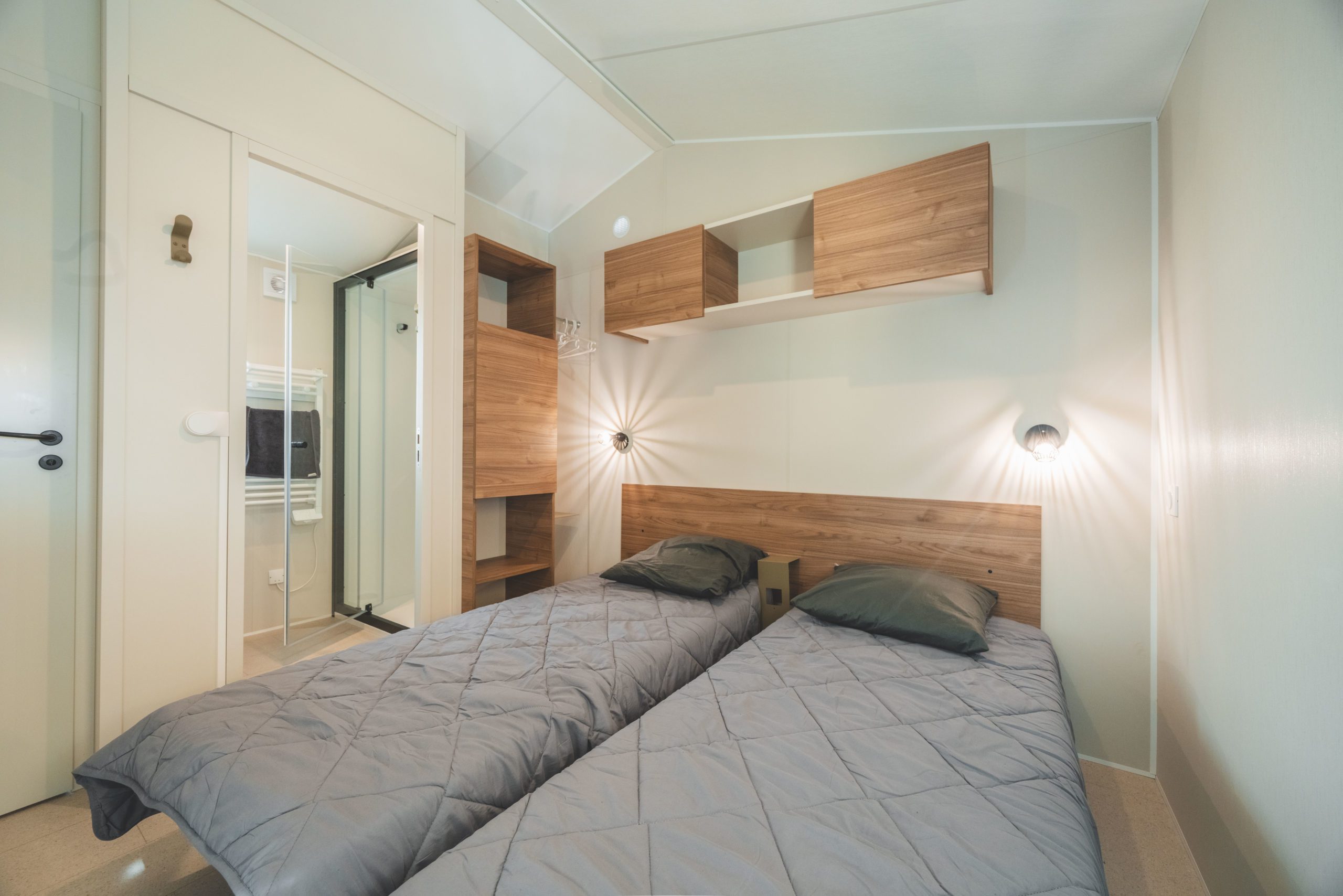 Mobil-home disposant 2 chambres avec 2 salles de bain idéales pour les couples d’amis. Chacun a son autonomie , son espace , sa propre salle de bain équipée d’une douche extra large et un wc indépendant.